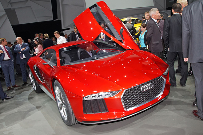 Das Vorprogramm ist damit abgeschlossen. Wenn man wieder ins Freie tritt, befindet man sich bereits so gut wie auf dem zentralen Platz, um den sich vor allem die Marken des VW- und des Daimler-Konzerns tummeln. Kompakt und mit kurzen Wegen. Zentral in der Mitte platziert, mit eigens entworfener Halle (Agora), findet sich Audi. In dem geschwungenen Rund sollten sich vor allem Kinder der 80er-Jahre und Fans von Rallye-Autos die Studie Sport Quattro nicht entgehen lassen. Das im klassischen Gelb lackierte Coupé transportiert den Geist des legendären Allraders optisch und technisch in die Jetztzeit. Möglicherweise soll es von dem bärenstarken Hybridmodell mal eine Kleinserie geben – die man ebenfalls wohl kaum jemals auf dem Supermarktparkplatz in der Nachbarschaft entdecken wird.