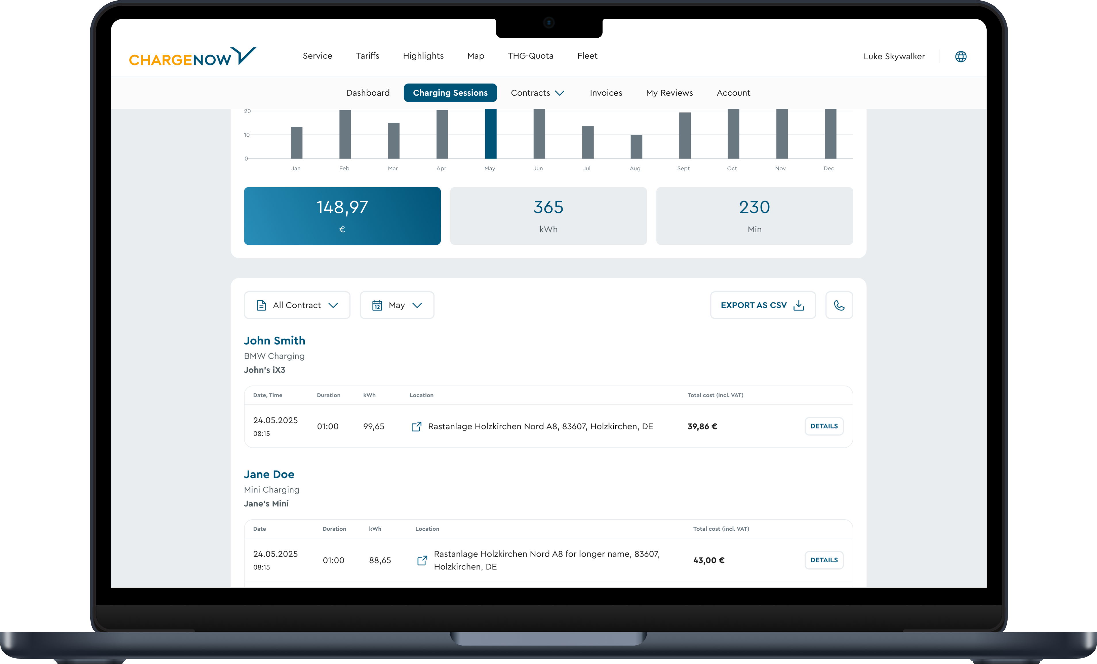 kostenlosen Manager-Konto. Alle Ladevorgänge werden auf einer Rechnung zentral zwischen Unternehmen und CHARGE NOW abgerechnet. Rückerstattungen werden dadurch überflüssig, der Verwaltungsaufwand sinkt und Unternehmen behalten die Kosten besser im Blick.