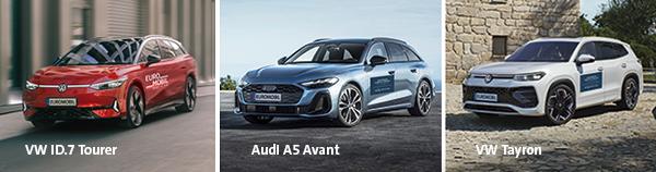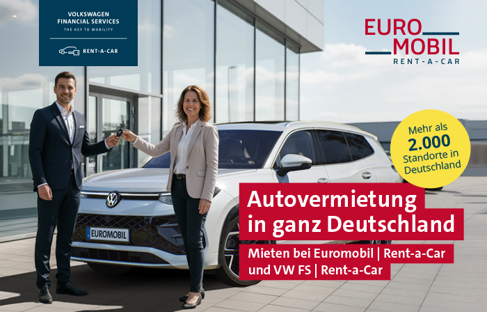 | Die Euromobil GmbH erbringt Mobilitätsleistungen unter der Geschäftsbezeichnung „Volkswagen Financial Services“. Als Markenvermietgesellschaft mit Anbindung an den Volkswagen Konzern bietet Euromobil GmbH passgenaue Mobilität für Privat- und Geschäftskunden. Bei den abgebildeten Fahrzeugen handelt es sich um Beispielfahrzeuge. |