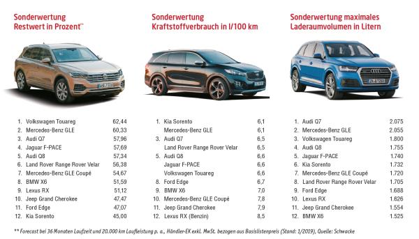 Mit den rund 175 kW erreicht ein SUV dieser Größenordnung in etwas weniger als acht Sekunden die Marke von 100 Stundenkilometern und eine Höchstgeschwindigkeit von rund 220 Kilometern pro Stunde. Beim Durchschnittsverbrauch liegen die ausgewählten Modelle im Bereich von 6,1 bis 8,5 Liter pro 100 Kilometer, dabei ist jedoch anzumerken, dass der einzig verbleibende Benziner (Lexus RX 300 AWD) trotz seiner 238 PS starken Maschine mit 8,5 Litern lediglich 25 Prozent über dem Durchschnittsverbrauch der Selbstzünder (6,76 Liter je 100 Kilometer) liegt. Den ersten Platz in der Sonderwertung „Kraftstoffverbrauch“ teilen sich aber der Kia Sorento und der Mercedes-Benz GLE. Das Podium in diesem Bereich komplettieren dann auch gleich zwei Modelle: Audi Q7 und Land Rover Range Rover Velar. Ein großvolumiger Tank mit einem Fassungsvermögen von 85 Litern beschert dem BMW X6 in der Kategorie „Reichweite“ mit 1.214 Kilometern den begehrten ersten Platz auf dem Podest. Mit 1.192 Kilometern, sprich einer um 22 Kilometer geringeren Reichweite, reiht sich die Coupévariante des Mercedes-Benz GLE auf Platz zwei ein. Das Podest vervollständigt der Jeep Grand Cherokee mit 1.184 Kilometer Reichweite. Doch Obacht: Bei den drei SUV-Vertretern auf den Podestplätzen sind die Kraftstoffbehälter größer als beim Rest der Vergleichskandidaten. Einige Hersteller bieten optional einen größeren Tank – natürlich gegen Aufpreis.